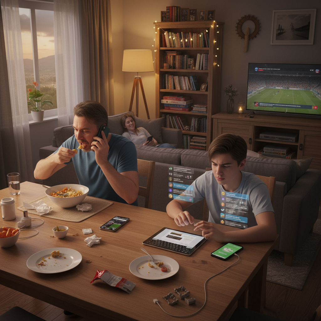Baba, bir taraftan hızlıca yemeğini yerken diğer taraftan gelen aramaları yanıtlıyor, arkadaşlarıyla bir gün önceki maçın hararetli kritiğini yapıyordu. Anne ise arkadaşının sosyal medyada paylaştığı yurt dışı gezisi fotoğraflarına bakmakla ve onları beğenmekle meşguldü. Ağabey, akşam oynayacakları çevrim içi oyunla ilgili arkadaş grubuna durmadan mesaj gönderiyordu.
